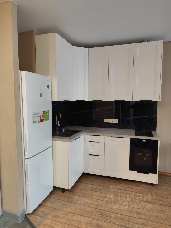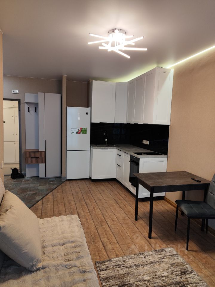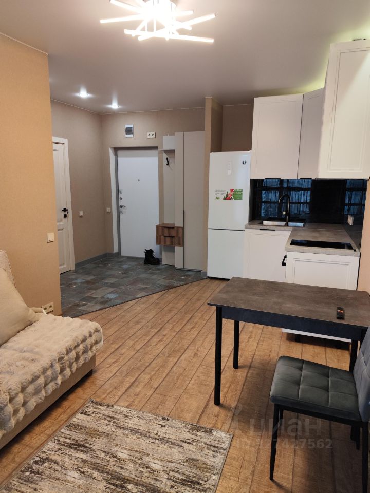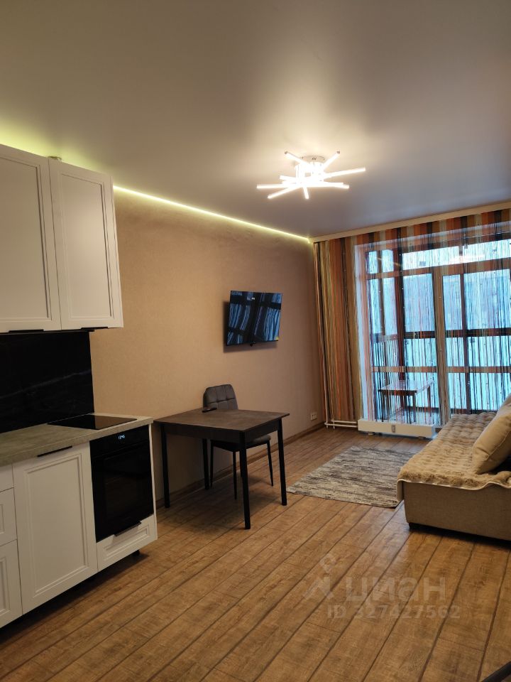 **Планировка:** просторная кухня с выходом на балкон, уютная комната, совмещённый санузел с ванной. **Интерьер:** свежая косметика, окна выходят на улицу, поэтому в квартире всегда светло и уютно. **Комфорт:** полностью меблирована, оборудована всем необходимым для жизни — холодильником, телевизором и стиральной машиной. **Общая площадь:** 35,23 кв.м, жилая площадь — 10,5 кв.м, кухня — 15,5 кв.м.