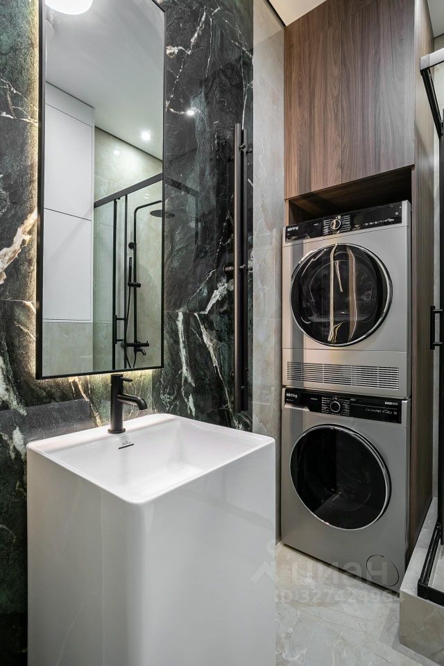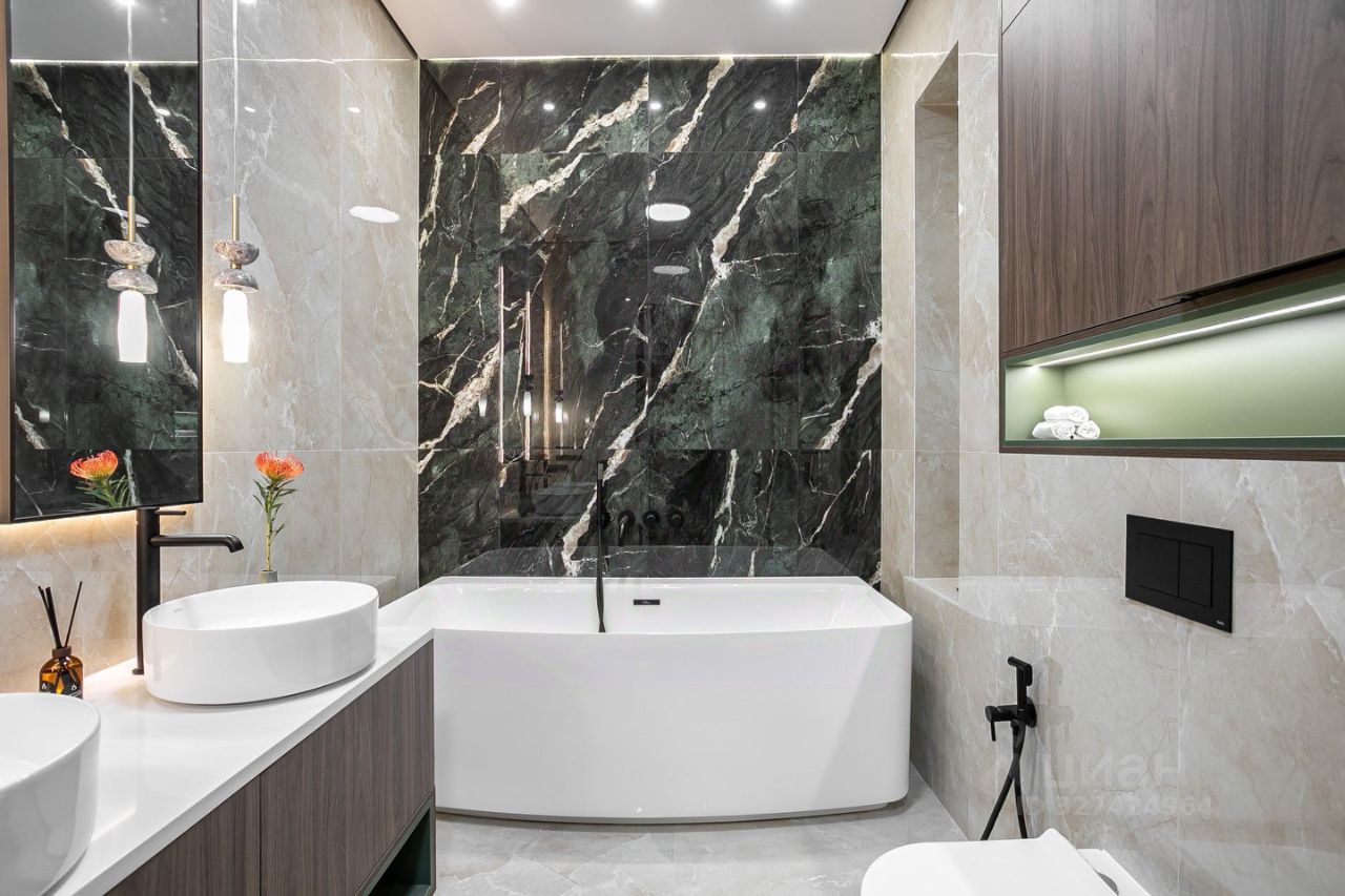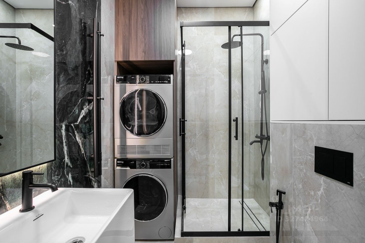 Кухня укомплектована техникой Bosch. Стиральная и сушильная машины Krting, сантехника Gеsenberg. В санузлах — крупноформатный керамогранит в кремовых оттенках с выразительным акцентным цветом.