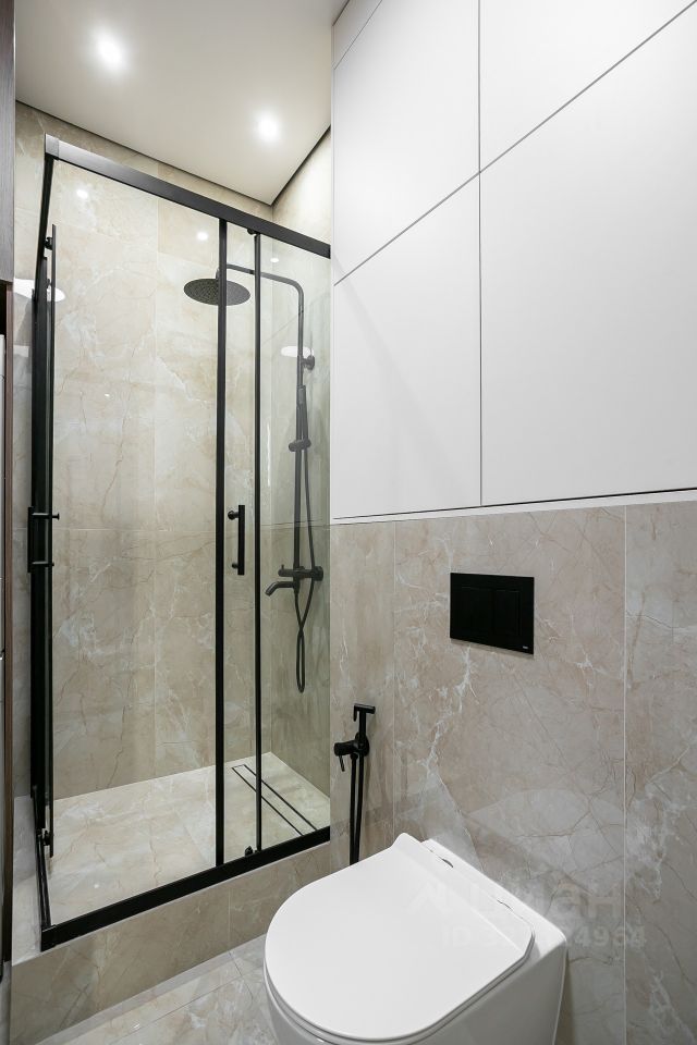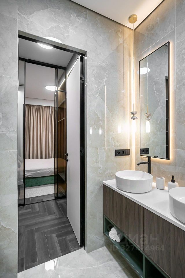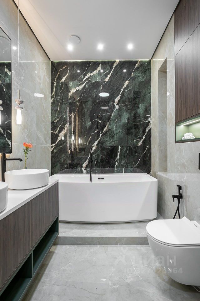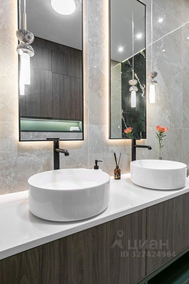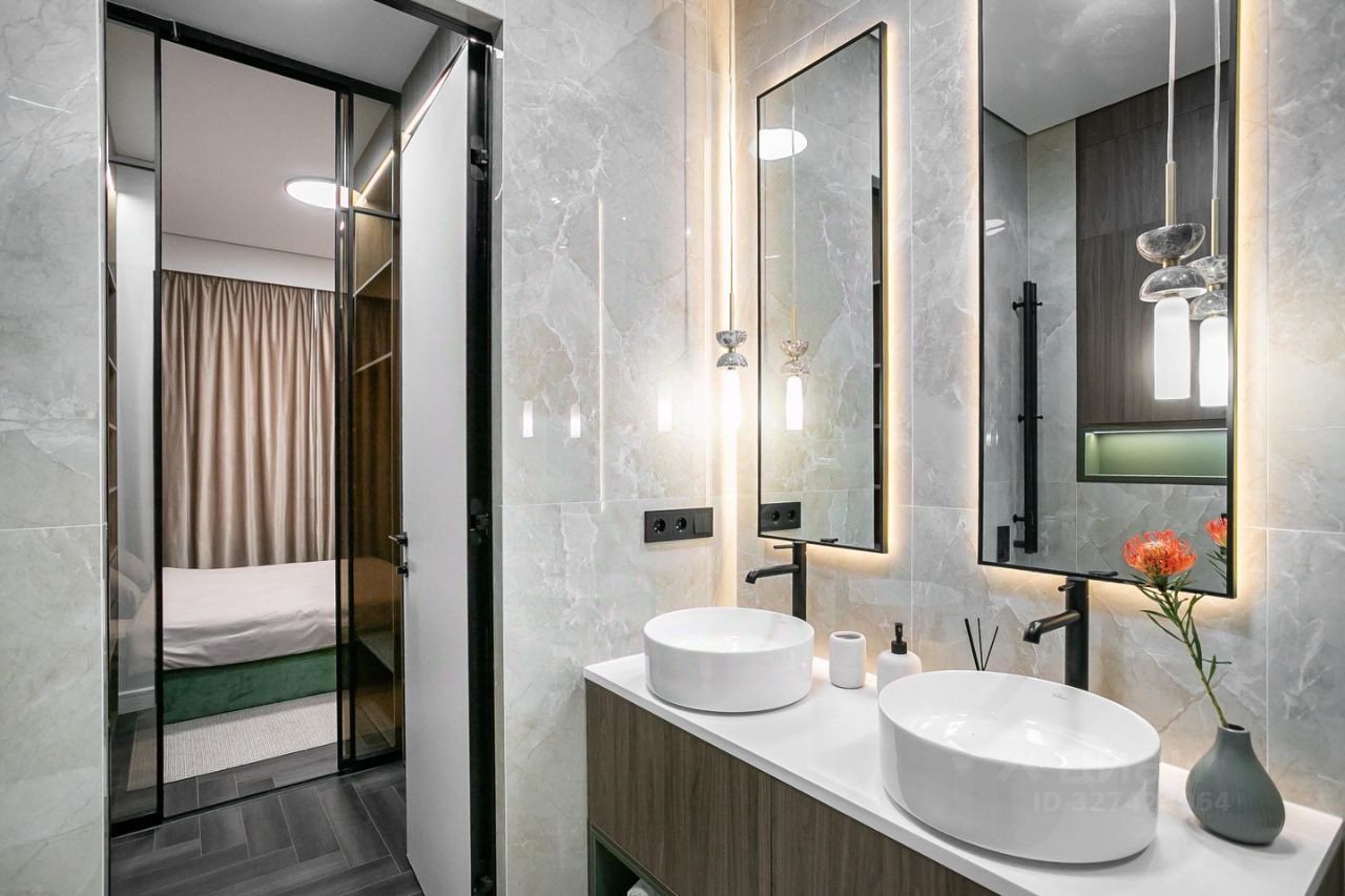 Кухня укомплектована техникой Bosch. Стиральная и сушильная машины Krting, сантехника Gеsenberg. В санузлах — крупноформатный керамогранит в кремовых оттенках с выразительным акцентным цветом.