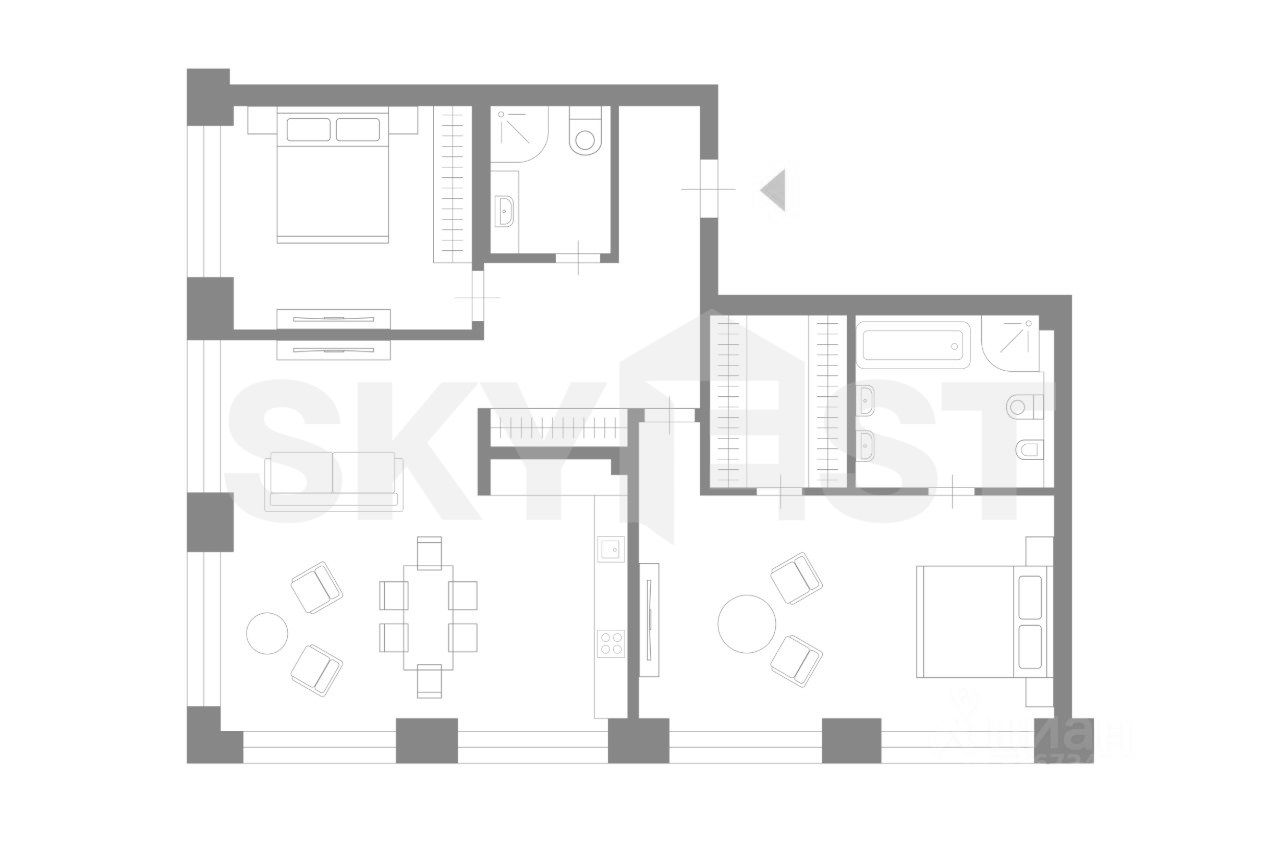 Планировка: кухня-гостиная, мастер-спальня с собственной гардеробной и ванной комнатой, спальня, гостевой санузел.