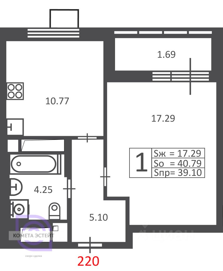 Общая площадь — 39.1 кв. м, жилая площадь — 17.2 кв. м, кухня — 10.7 кв. м. Высота потолков 2.8 м