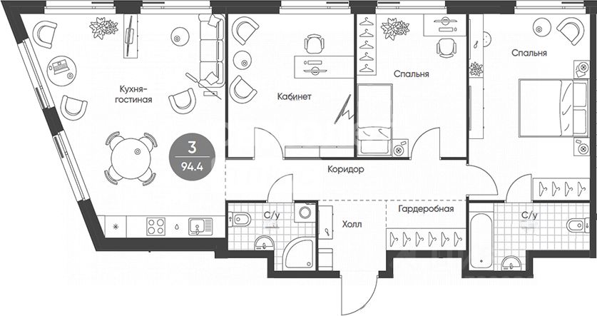 3 спальни и просторная кухня-гостинная.