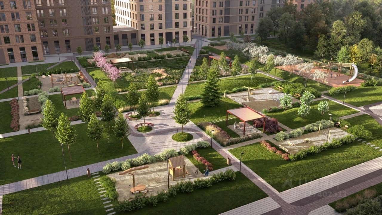Благоустройство Благоустроенная территория комплекса делится на внешнюю и внутреннюю. Внутренняя часть - это закрытый двор 0,9 га, где обустраиваются детские площадки для разных возрастных групп, беседки для отдыха и работы, несколько спортивных зон, включая воркаут-зоны и лужайку для бадминтона. Здесь же появится ухоженный луг с прогулочными маршрутами. Рядом с жилым комплексом будет создан ландшафтный парк площадью 2,4 га. В парке будут высажены высокие деревья, луговые травы и кустарники, благоустроены лаунж-зоны у пруда, дорожки для бега и прогулок. В центре парка предусмотрена событийная площадь, рядом расположатся дополнительные спортивные и детские площадки, а также зона для выгула домашних питомцев.