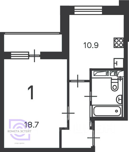 Общая площадь — 39.3 кв. м, жилая площадь — 18.7 кв. м, кухня — 10.9 кв. м.