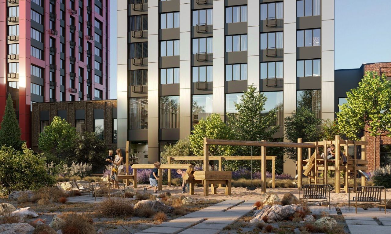 Благоустройство: Внутренний двор комплекса разработан совместно с бюро GAFA. Основная идея - создать аналог Центрального парка в Нью-Йорке, гармонично сочетая высотные здания и большое изолированное парковое пространство. Вся площадь двора-парка будет огорожена и составит более 2 га, из которых 45% - озеленение. Одним из самых важных ландшафтных элементов здесь станет небольшая речка, наполняющаяся во время дождя. Вокруг неё появится сеть из островов, внутри которых расположатся тематические зоны спорта и отдыха.