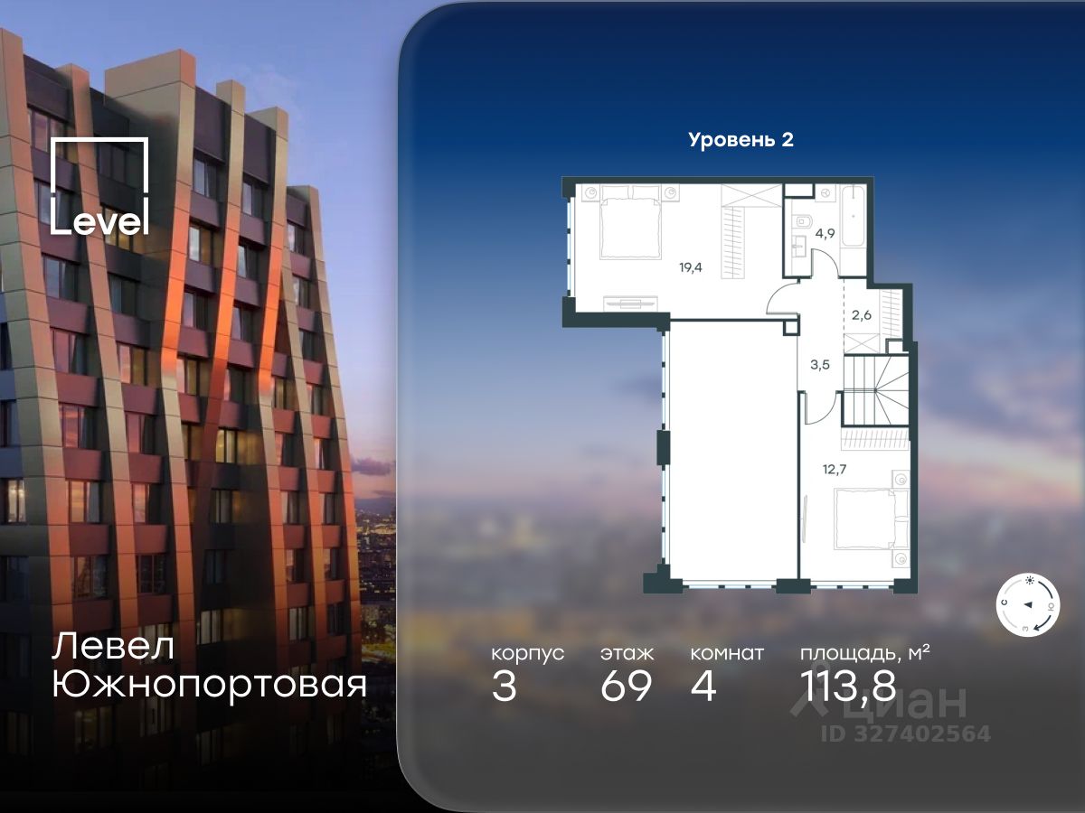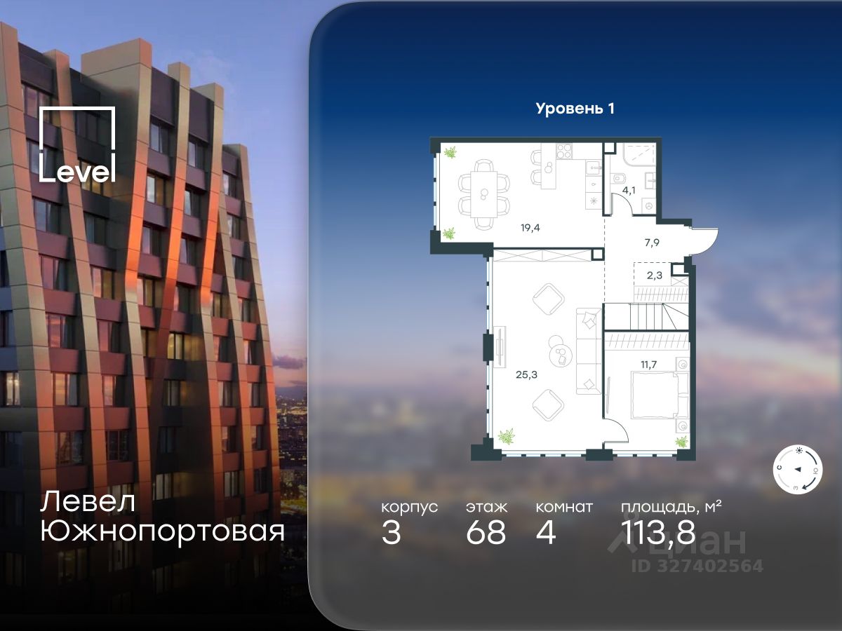 В северной части района Печатники продается 4-комнатная квартира площадью 113.80 кв.м без отделки. Квартира расположена на 68 этаже 68-этажного корпуса 3 в жилом комплексе комфорт-класса Левел Южнопортовая (компания Level Group/Левел групп).