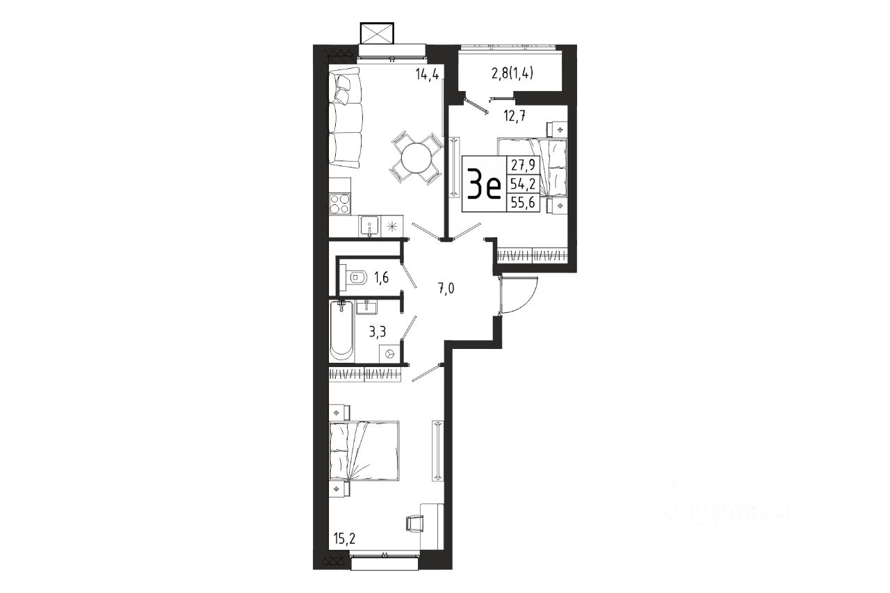 Продаётся 2-комнатная квартира в строящемся доме (Корпус 8 (2 очередь)), общей площадью 55.60 кв.м., на 3 этаже.