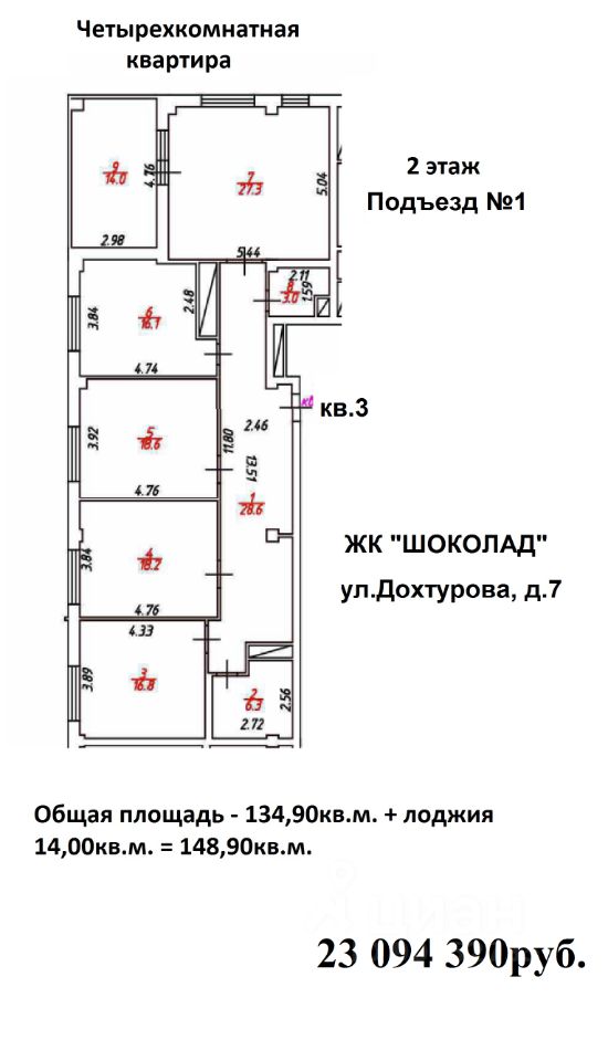 Продаётся 4-комнатная квартира в сданном доме (Дохтурова, 7), срок сдачи: I-кв. 2023, общей площадью 148.9 кв.м., на 2 этаже. Жилой комплекс ''Шоколад'' расположен в Ленинском районе города.