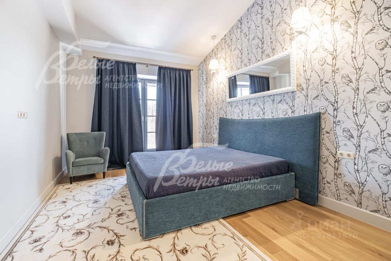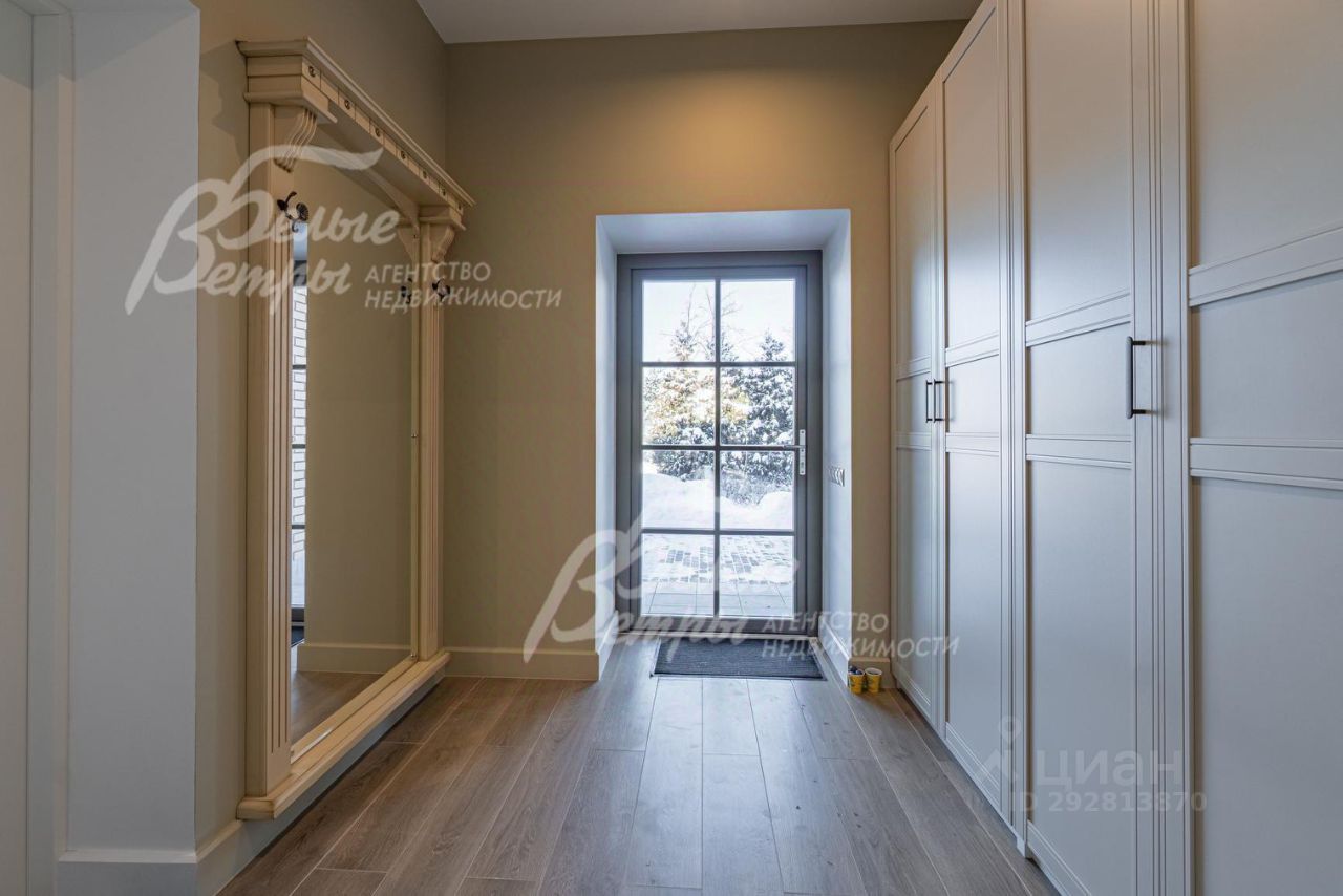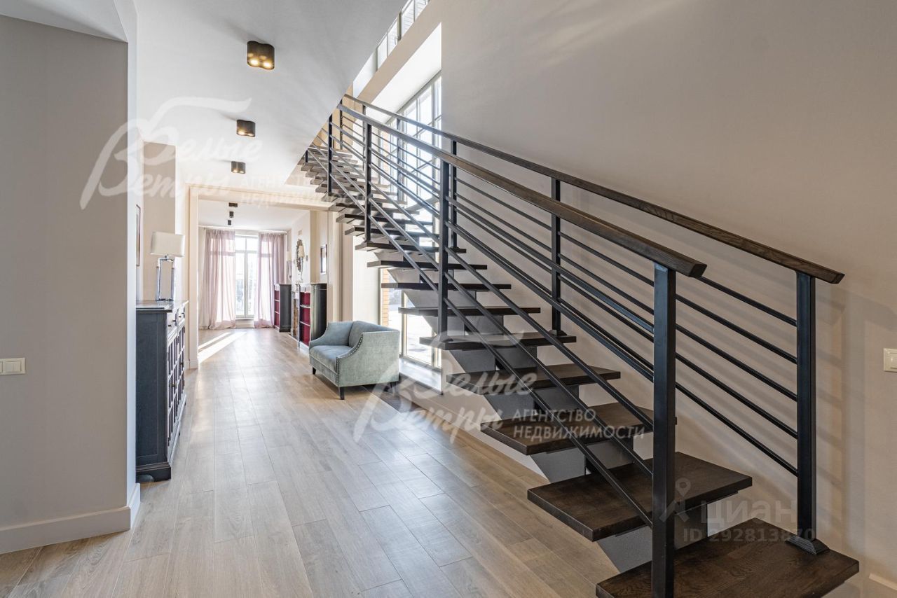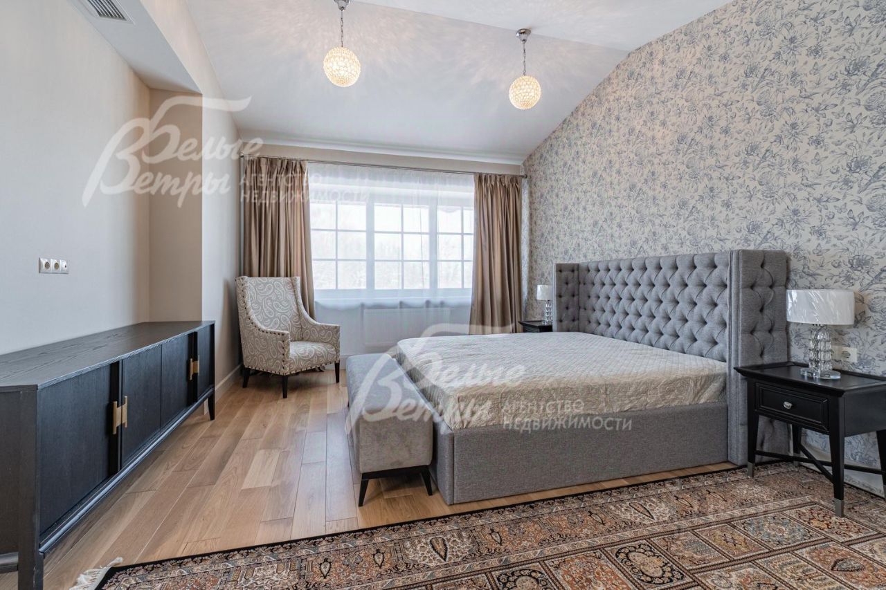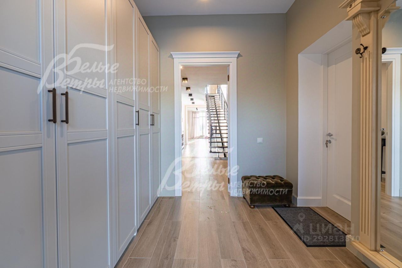 Описание внутренней отделки: дизайнерская отделка в современном стиле: комбинированная отделка стен-покраска и вставки из высококачественных обоев, на полу итальянская плитка и инженерная доска. Дубовая лестница. Двери - натуральный шпон. Потолки окрашены, разноуровневые. Встроенные шкафы и гардеробные..