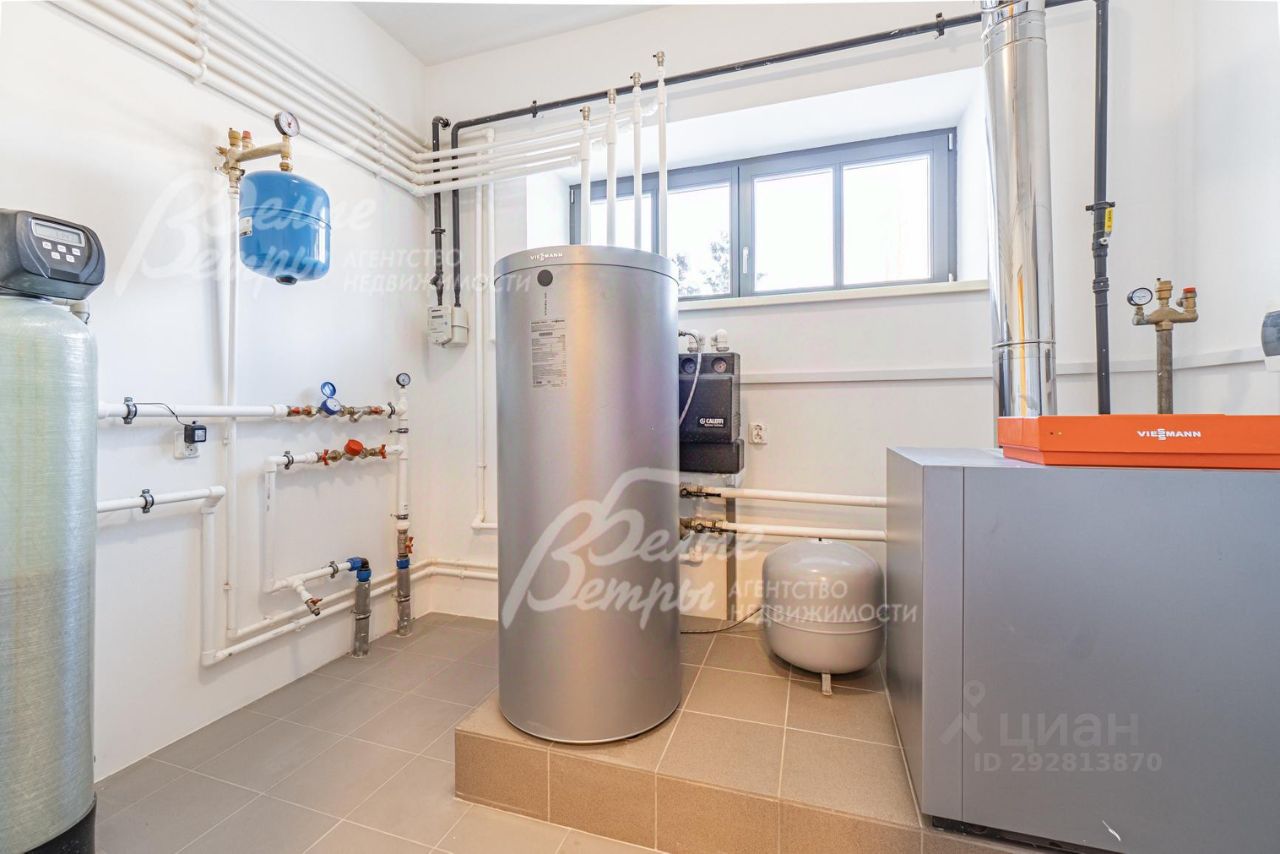 Инженерное обеспечение: котельная полностью оборудована - установлен котел ''Viessmann'' на 42 кВт и бойлер ''Viessman Vitocell 100'' на 200 л. Многоступенчатая очистка воды. В помещениях установлены радиаторы, тепловые конвекторы везде, где панорамные окна. Теплые полы в гостиной, кухне и в санузлах. Центральная вентиляционная система во всех помещениях с индивидуальными панелями управления температурным режимом и климатом по комнатам,.