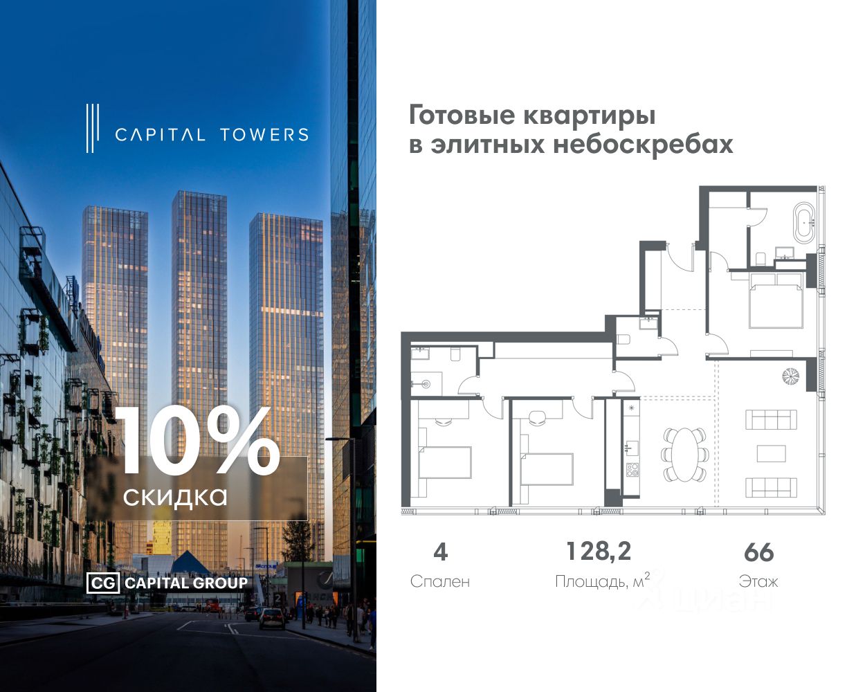 Capital Towers — это три современных жилых небоскрёба у Москва-Сити на берегу реки. Высота каждой башни — почти 300 метров, из окон открываются панорамные виды на центр Москвы, Москва-Сити, Лужники, МГУ и парк ''Красная Пресня''