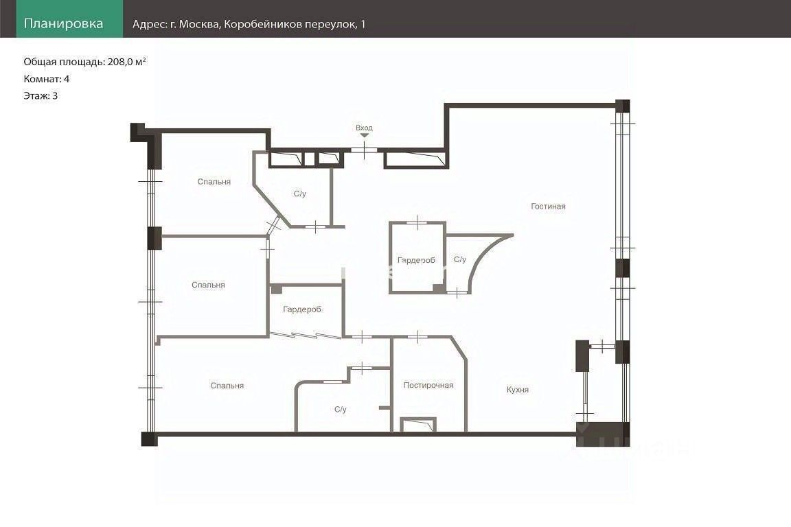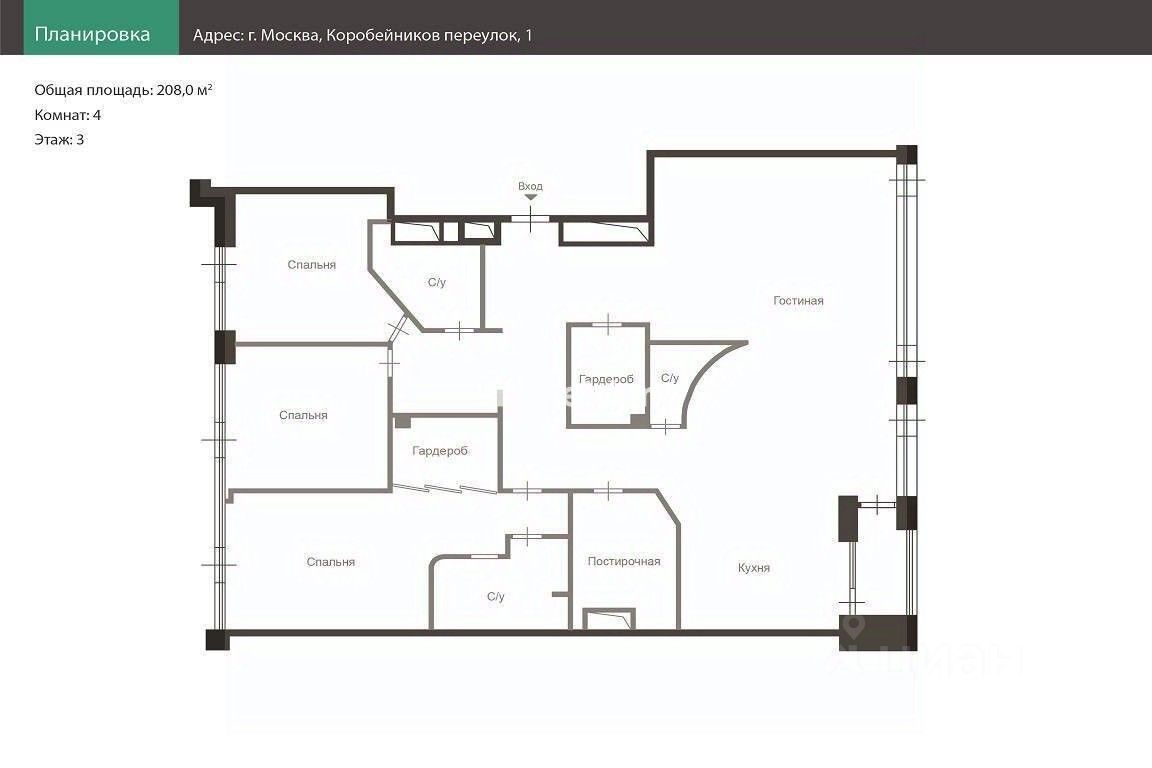ID 22105 Предлагается квартира площадью 208 кв. м. в жилом комплексе ''Кристалл Хаус''. Квартира имеет свободную планировку, позволяющую создать жилое пространство на любой вкус. Окна выходят в тихий переулок. В наличии 2 машиноместа в подземном паркинге.
