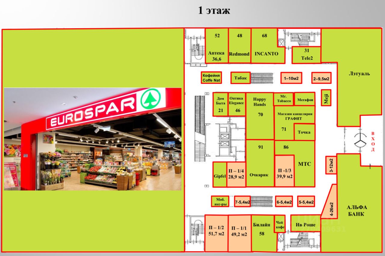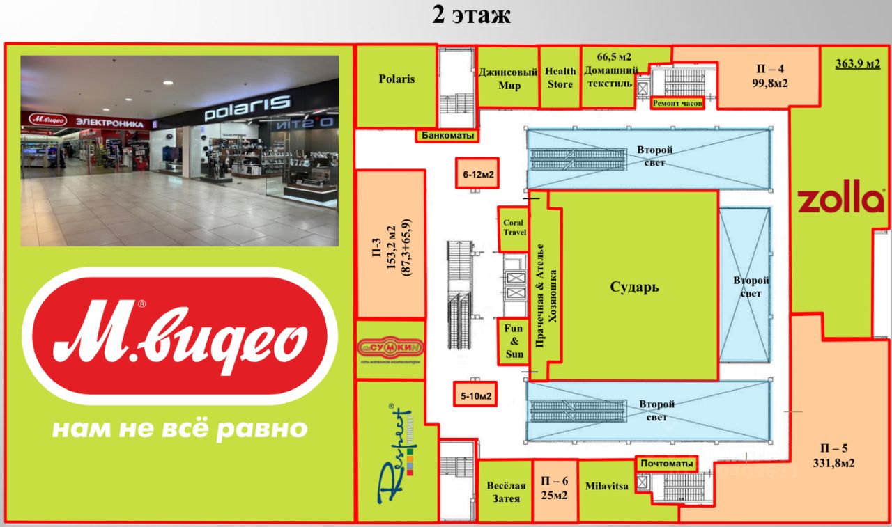 Прямая аренда от СОБСТВЕННИКА. Помещение находиться на 2 этаже, возможно увеличить или уменьшить площадь, есть блоки на 1 этаже(смотрите планы). Главный вход в ТРЦ расположен со стороны ул. Вен?вская. На 1 и 2 этажах расположены разноформатные торговые помещения (одежда, обувь, сотовая связь, оптика, аптека, парфюмерия, ювелирные, туристическая фирма, отделение банка и т.д.), продовольственный супермаркет EUROSPAR и крупный магазин по продаже электро бытовой техники М.Видео. - На 3 этаже находятся: Детский развлекательный центр НЕБО спорт и развлечение. KFC, ИЗИ паб (пивной), TRATTORIA(ресторан итальянской кухни). - На 4 этаже расположен сетевой фитнес клуб с бассейном ГОЛДЕН . В здании размещена подземная автостоянка на -1 уровне для размещения 300 а/м.