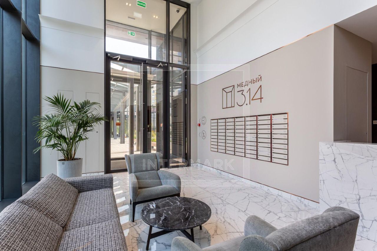 ЖК Медный 3.14 - премиальный проект в Донском районе. Комплекс включает 3 башни переменной этажности. Первый этаж занимает стильное лобби с высокими потолками. За стойкой ресепшн дежурит консьерж, для встречи гостей оборудована уютная зона ожидания. Внутренняя территория закрыта от посторонних и охраняется. В аккуратном дворике высажены газоны, пышные кустарники и деревья. Работают салон красоты и кафе.