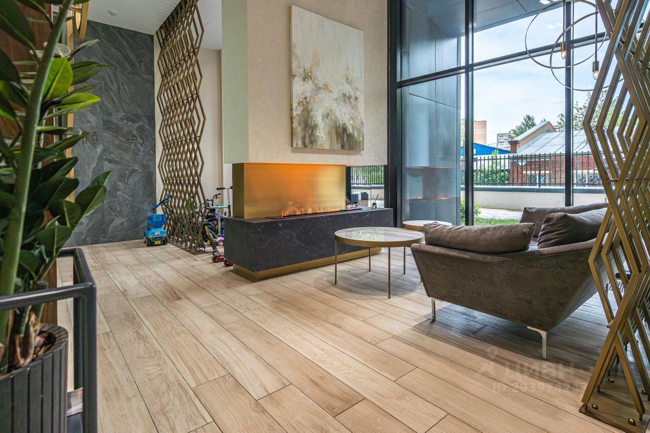 В подъезде с консьержем атмосферная лаунж зона с камином для ожидания или переговоров.