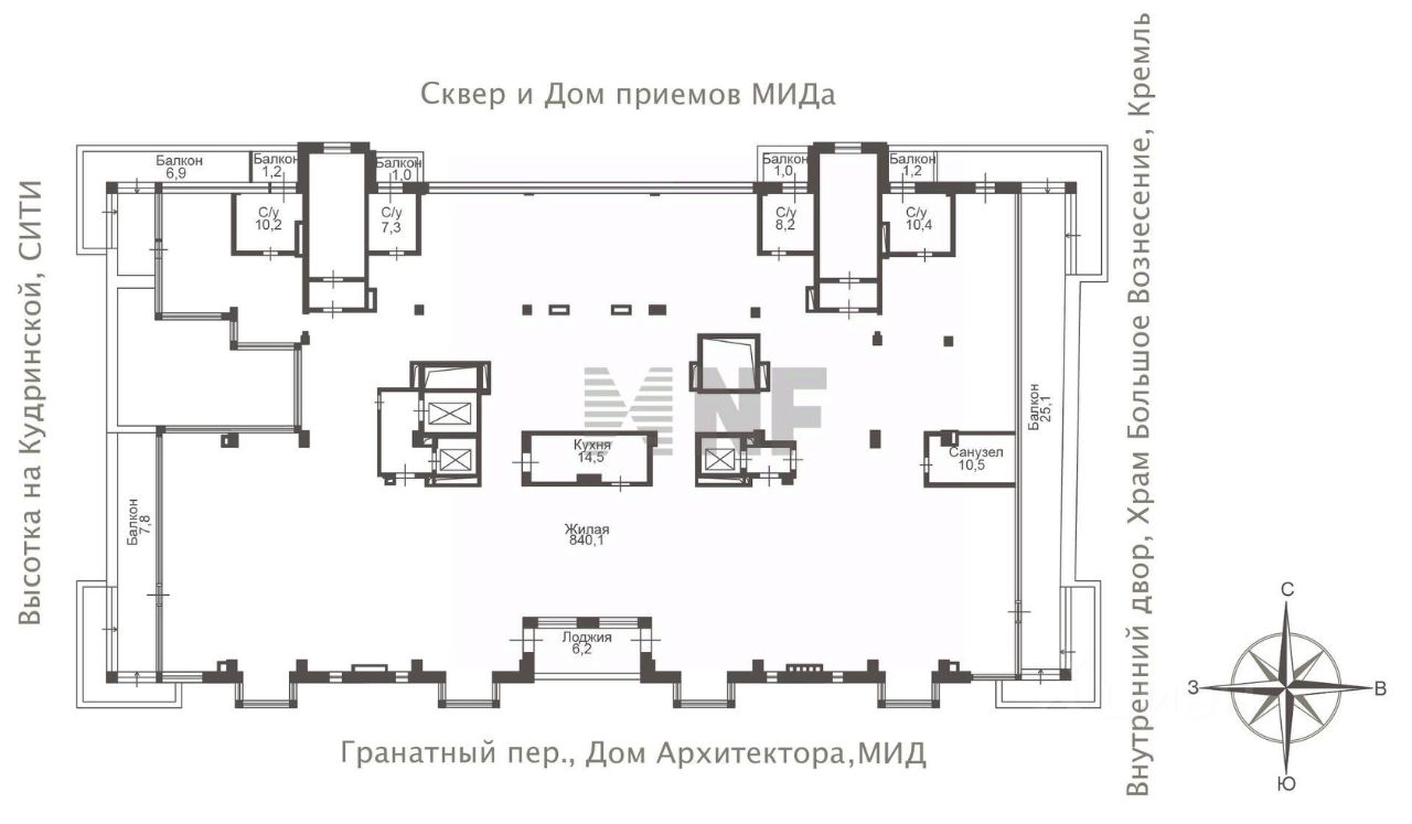 Планировка свободная, пространство легко делится на гостевую зону и приватную зоны с возможностью в каждой установить настоящий дровяной камин. Планируется до 9 спален. Предусмотрены два парадных и два дополнительных входа с отдельными лифтами для каждого и выход на эксплуатируемую кровлю. Высота потолков 3,8 м. Панорамные окна ориентированы на четыре стороны, открывается вид на Центральный Дом Архитектора, Храм Вознесения Господня у Никитских ворот, высотку на Баррикадной, Дом приемов МИД и зеленые переулки Патриарших прудов. За отдельную стоимость 4 машино-места в подземном паркинге. Жилой комплекс ''Гранатный, 8'' входит в число лучших домов категории deluxe в Москве по местоположению, уровню комфорта и инфраструктуре. Входные группы оформлены натуральным мрамором, деревом, украшены классическими колоннами, резными коваными перилами, массивными хрустальными люстрами. Территория находится под охраной и видеонаблюдением. Внутренний двор с ландшафтным дизайном скрыт от посторонних глаз. К услугам жильцов консьерж-служба, сауна, бассейн с противотоком, хамам, джакузи, тренажерный зал, сигарная комната, помещение для хранения шуб. Имеется оборудованный кабинет для работы личных стилистов и имиджмейкеров.